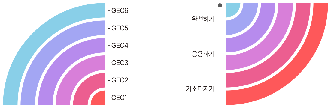 GEC 트랙은 GEC-1, GEC-2, GEC-3, GEC-4, GEC-5, GEC-6의 6단계 수준별 과정으로 구성됩니다.